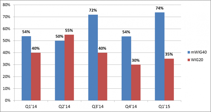 Dużo lepiej sprawa wygląda w przypadku kojarzonego ze spółkami średniej wielkości indeksu mWIG40. W jego gronie aż 74 proc. firm odnotowało w I kw. wyniki lepsze niż rok wcześniej. To wyraźny skok w porównaniu z IV kw. ub.r. Tak wysoko obserwowany przez nas wskaźnik nie był co najmniej od pięciu kwartałów (warto zwrócić uwagę, że widoczne na wykresie historyczne statystyki dotyczą historycznych, czyli rzeczywistych w danym momencie, składów indeksów, a nie tego obecnego).