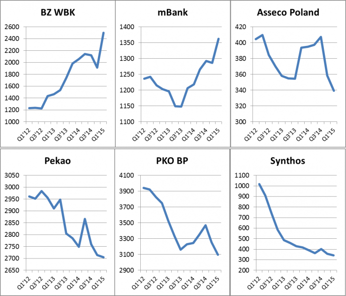 To co nie zmieniło się radykalnie w porównaniu z poprzednim kwartałem, jak i jeszcze wcześniejszymi, to znaczne różnice między WIG20 i mWIG40. Blue chips wchodzące w skład tego pierwszego indeksu nadal pozostają wyraźnie w tyle – tylko 35 proc. z nich odnotowało poprawę wyników w I kw. Pod tym względem nie widać ciągle przełomu. Zysków nie udało się zwiększyć spółkom z rozmaitych sektorów – począwszy od dwóch największych banków (PKO BP i Pekao), poprzez niektóre firmy surowcowe (KGHM, Bogdanka) i Orange, a skończywszy na dawnych liderach poprawy wyników: LPP i Eurocash.
