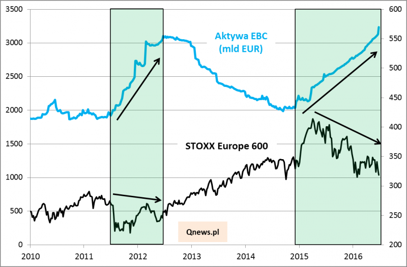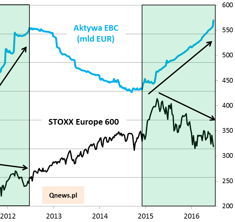 Być może jednak pewnej wskazówki udziela historia. Gwałtowny wzrost aktywów EBC miał już miejsce - w latach 2011/2012. Także wtedy sytuacja na rynkach akcji daleka była od hossy - dominowały obawy. Zdecydowana poprawa koniunktury nastąpiła, gdy ... EBC przestał "uszczęśliwiać" rynki dodatkową płynnością. Być może więc i tym razem inwestorzy na dobre ucieszą się dopiero wtedy, gdy na horyzoncie pojawi się szansa na zniknięcie czynników, które zmuszają EBC do agresywnego "luzowania".