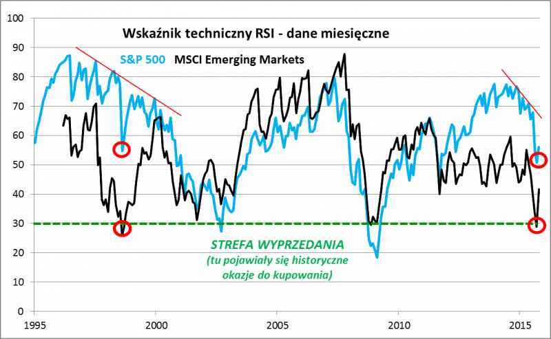 W sierpniu-wrześniu kilkakrotnie zwracaliśmy uwagę (np. tutaj) na podobieństwo obecnej sytuacji na globalnych rynkach do tej z 1998 roku, kiedy amerykański S&P 500 mocno skorygował się ze szczytów hossy, podczas gdy indeks rynków wschodzących pod wpływem obaw przez kryzysem zszedł do poziomów najniższych od lat. Na półmetku października sprawdźmy co pozostało z tej analogii. Tradycyjnie odwołajmy się do naszego ulubionego wskaźnika RSI pokazującego przegrzanie/schłodzenie koniunktury, tyle że wg danych miesięcznych (wówczas łatwo zdać sobie sprawę z tego, w jakim punkcie cyklu jesteśmy).
