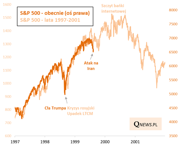 Taka konkluzja płynie choćby z poniższego wykresu, który po raz pierwszy pokazywałem przed niespełna rokiem, gdy S&P 500 podnosił się z tąpnięcia wywołanego przez cła Trumpa, co niezwykle przypominało analogiczne wydarzenia z 1998 roku, gdy indeks najpierw runął pod wpływem tzw. kryzysu rosyjskiego, by potem szybko odrobić straty.