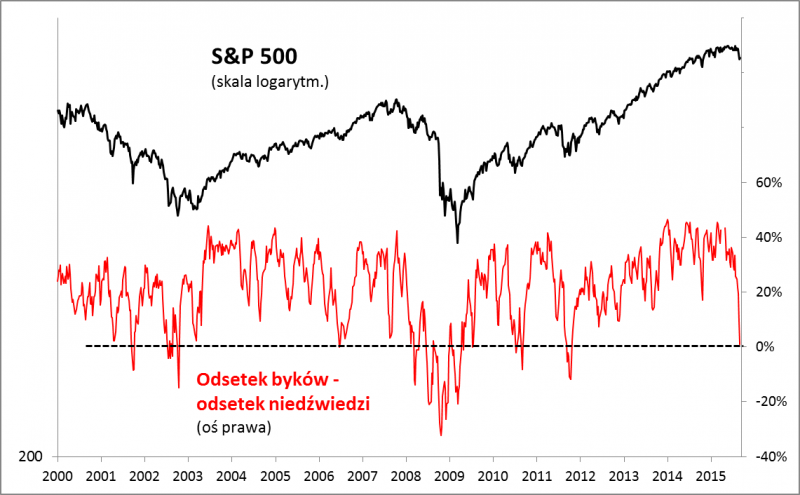 „Bój się, gdy inni są żądni zysków i bądź żądny zysków, gdy inni się boją” – to słynne powiedzenie Warrena Buffetta dobrze obrazuje, dlaczego znaczne pogorszenie nastrojów rynkowych w ostatnich miesiącach można postrzegać pozytywnie (a nie negatywnie). Lista wskaźników, według których humory inwestorów znacznie się pogorszyły, jest długa – oto tylko wybrane z nich: począwszy od odsetka niedźwiedzi w sondażu rodzimego Stowarzyszenia Inwestorów Indywidualnych (ponad 40 proc. w dołku wyprzedaży, wobec niespełna 19 proc. w końcu kwietnia), poprzez zobrazowane na wykresie badanie wśród amerykańskich autorów newsletterów inwestycyjnych, a skończywszy na zwanym „indeksem strachu” indeksie VIX (przelotnie ponad 40 pkt. – to prawie połowa rekordowej wartości z okresu największej paniki po upadku Lehman Brothers na jesieni 2008 r.; na rynkach wschodzących – ponad 50 pkt.).