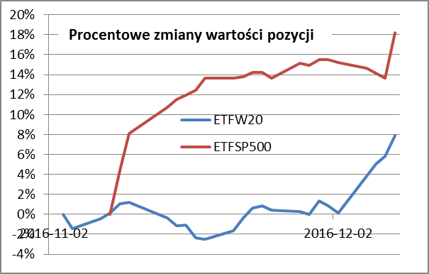 W czwartek zgodnie z zapowiedzią na otwarciu sesji otworzyliśmy wirtualną pozycję na rynku złota (po cenie 484 zł + 5 zł prowizji), które może stanowić przeciwwagę dla inwestycji w akcje. Dziś wykonamy kolejny ruch - na otwarciu sesji sprzedamy wszystkie posiadane instrumenty ETFSP500. Zrealizujemy w ten sposób pokaźny zysk (+18% w ciągu miesiąca!, po części dzięki umocnieniu USD). Zakładamy, że w nieodległej przyszłości będziemy mogli je odkupić taniej. Może się też okazać, że będziemy żałować przedwczesnej sprzedaży, ale nasz portfel z natury ma dość konserwatywny charakter.