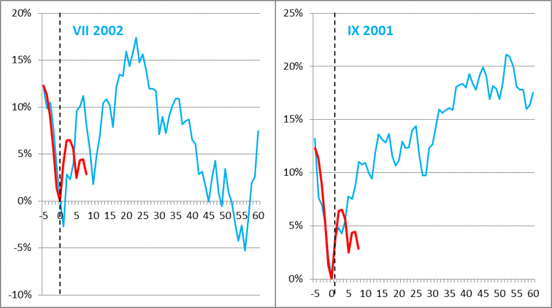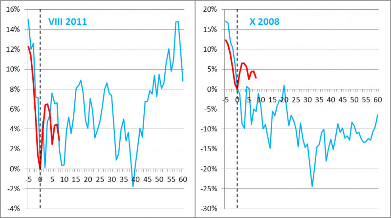 • podobieństwo do tych dwóch przypadków każe oczekiwać: (a) kontynuacji ocieplenia nastrojów w najbliższym czasie; (b) powrotu do dołka w terminie 27-33 sesji od pierwotnego dołka, czyli w okolicach przełomu września/października, (c) potem trwalszej poprawy nastrojów;