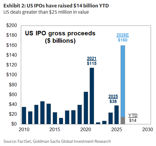 Wspomniane 14 mld USD pozyskane z ofert publicznych do tej pory w tym roku to i tak dopiero wstęp do tego, co może czekać inwestorów w dalszej części 2026. GS prognozuje, że w całym roku łączna wartość IPO może osiągnąć astronomiczne 160 mld dolarów.