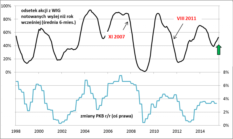 Zauważmy jak dobrym barometrem nasz wskaźnik był historycznie - jego zmiany odbywały się równolegle do zmian PKB (przy czym o tych drugich zawsze dowiadujemy się z co najmniej kilkumiesięcznym opóźnieniem) lub - szczególnie w ostatnich latach - wyprzedzał je. Krach w sierpniu 2011 r. miał miejsce, gdy nasz barometr był już w wyraźnym trendzie spadkowym, zapowiadając mocne schłodzenie gospodarki. Z kolei startowi bessy na jesieni 2007 r. również towarzyszyło załamanie wskaźnika.