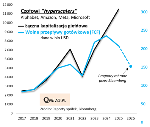Z tego punktu widzenia co najmniej zastanawiające jest to, że przy spadku FCF łączna kapitalizacja giełdowa czołowych hyperscalers urosła w ub.r. o prawie jedną czwartą. To zjawisko zdecydowanie nietypowe, bo zwykle oba te wskaźniki poruszają się w tym samym kierunku.