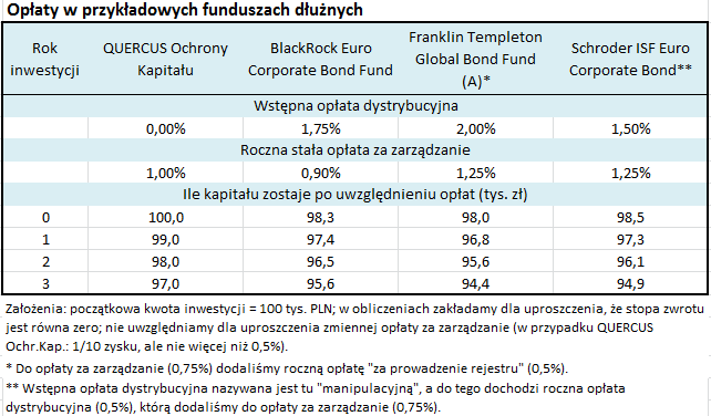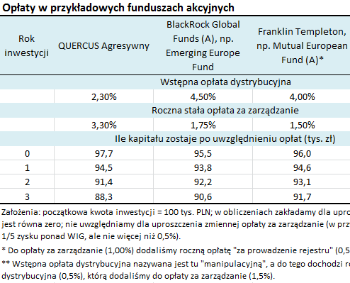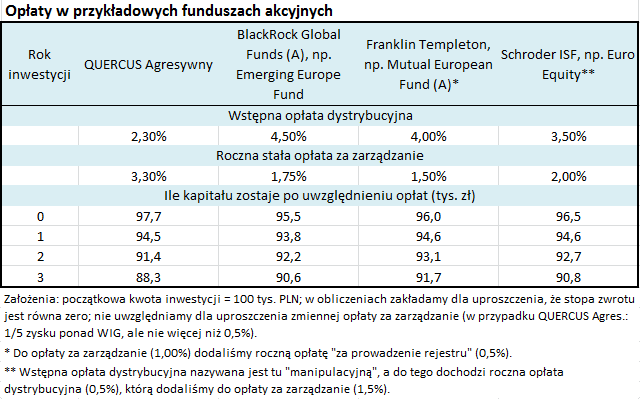 Wniosek jest taki, że na wstępie inwestycji to fundusze zagraniczne okazują się droższe (ze względu na opłaty dystrybucyjne). Potem niższa opłata za zarządzanie zaczyna działać na ich korzyść, ale po trzech latach inwestycji różnice nie okazują się tak duże, jak się powszechnie sądzi. Łączny koszt w przypadku QUERCUS Agresywnego po trzech latach to 11,7% początkowej inwestycji, natomiast w przypadku analizowanych funduszy zagranicznych jest to ok. 8-9%. Przy zmienności cechującej produkty akcyjne, różnica w kosztach nie jest więc aż tak znacząca.