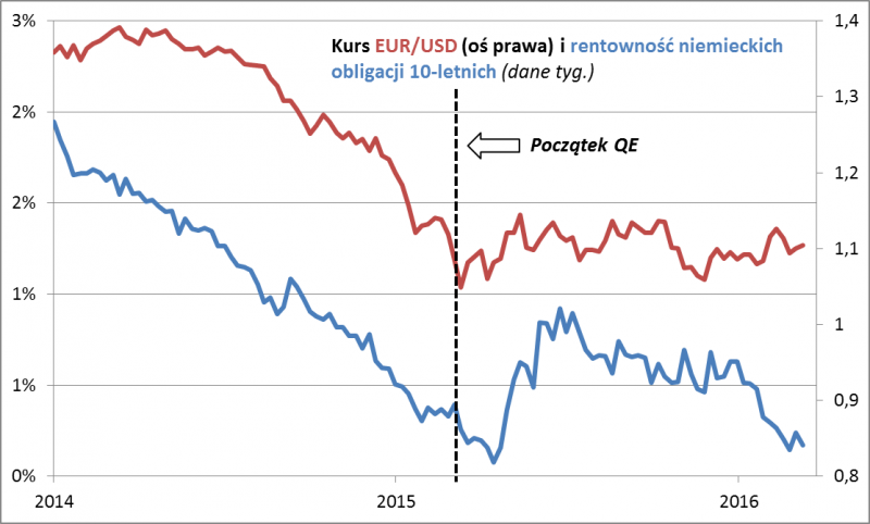 Czyli krótko mówiąc - rok po uruchomieniu gigantycznego skupu obligacji EBC powiększa go jeszcze bardziej. Bezpośrednią konsekwencją tych działań jest presja na utrzymanie na niskich poziomach kursu euro względem np. dolara oraz rentowności obligacji skarbowych.