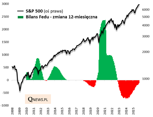 • istnieje pewna dodatnia relacja między koniunkturą na Wall Street a zmianami bilansu Fedu; wygląda na to, że już samo stopniowe wygaszanie QT pomagało w utrzymaniu trendu wzrostowego S&P 500 w ostatnich dwóch latach, zaś oczekiwany wzrost bilansu, nawet jeśli relatywnie powolny i niejednostajny, będzie raczej pozytywny niż negatywny;
