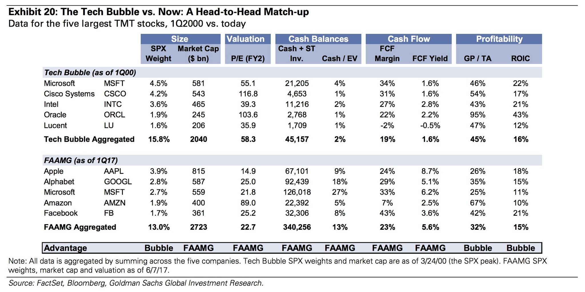 O krótkoterminowych losach akcji trudno się wypowiadać, natomiast podtrzymujemy tezę o tym, że o niebezpiecznej euforii porównywalnej z bańką internetową z przełomu wieków nie sposób mówić. W tę tezę ciekawie wpisuje się porównanie analityków Goldman Sachs, na które natrafiliśmy. Otóż zestawili oni rozmaite parametry największych spółek technologicznych teraz i w szczycie bańki internetowej, której konsekwencje okazały się potem bardzo bolesne.