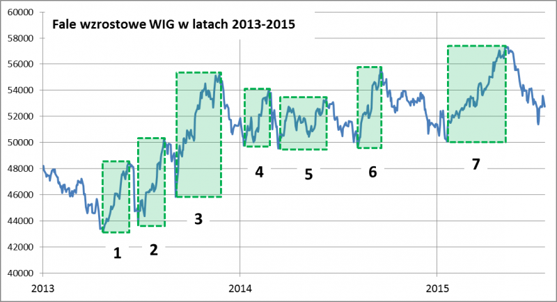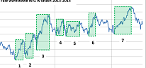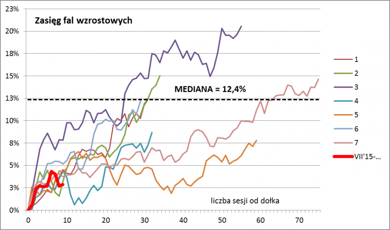 Oczywiście nie ma żadnej gwarancji, że to już koniec trudniejszego okresu dla posiadaczy akcji, ale już teraz - wybiegając w przyszłość - warto pokusić się o kolejne ćwiczenie. Sprawdźmy jaki zasięg miały w przeszłości fale wzrostowe następujące po porównywalnych korektach spadkowych. Bazować będziemy na okresie od początku 2013 roku - jest on wystarczająco długi, by zebrać odpowiednią liczbę przypadków do analizy (siedem), a jednocześnie jest porównywalny do obecnej sytuacji pod względem zmienności i mnogości czynników ryzyka (najpierw strach przed wygaszaniem QE w USA i "odchudzeniem" OFE o obligacje skarbowe, potem konflikt rosyjsko-ukraiński, a ostatnio kryzys grecki i eskalacja antybankowych postulatów politycznych).
