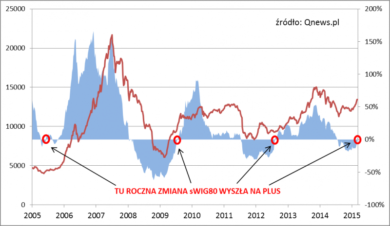 Na powyższym wykresie pokazujemy kiedy z podobnymi zdarzeniami mieliśmy do czynienia w przeszłości. Konkluzja jest taka, że - po pierwsze - roczna zmiana wychodziła na plus zawsze już po ustanowieniu dna bessy, czyli po rozpoczęciu fali hossy (co jest dość logiczne), a po drugie - sygnał ten stanowił zapowiedź kontynuacji trendu wzrostowego. Poprzednio z podobnym sygnałem mieliśmy do czynienia w lipcu 2012 r. - potem hossa "maluchów" trwała jeszcze (z przystankami) aż do jesieni 2013 r.