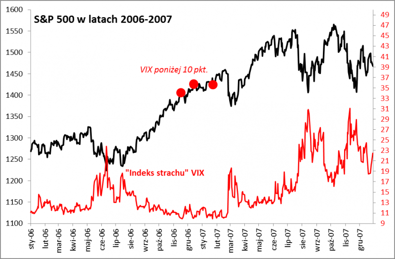 Jedynym innym okresem, w którym pojawiły się wartości VIX-a poniżej 10 pkt. (na zamknięciach), był XI 2006 - I 2007.
