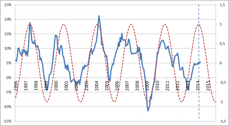 Przegląd komentarzy ekonomistów pozwala odnieść wrażenie, że panuje wśród nich dość zgodna („konsensusowa”) wizja: wzrost gospodarczy będzie przyspieszał, zwłaszcza że w 2015 r. czekają nas intensywne inwestycje infrastrukturalne. Szybszy wzrost PKB byłby oczywiście dobrą wiadomością dla rynku akcji. Według takiej wizji ostatnie negatywne sygnały (np. mocny spadek monitorowanego przez nas wskaźnika PMI) to jedynie chwilowa usterka w cyklu wzrostowym.