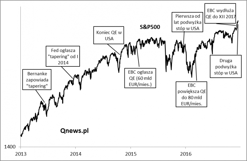 Zupełnie inne przemyślenia nasuwają się z kolei, jeśli chodzi o Europejski Bank Centralny, który zdaje się działać ze sporym opóźnieniem względem Fedu. Najpierw mocno opierał się przed wprowadzeniem QE na wzór amerykański, aż wreszcie sięgnął po to eksperymentalne narzędzie w monstrualnych rozmiarach i akurat wtedy, gdy Fed się z niego … wycofał. Problem polega na tym, że EBC nie zamierza się z tego eksperymentu szybko wycofać, a to może oznaczać, że jak wreszcie zajdzie taka potrzeba (inflacja blisko celu na poziomie 2 proc.), będzie miał w przeciwieństwie do Fedu bardzo mało czasu na działanie. A to mogłoby wywołać prawdziwy szok rynkowy. Wydaje się, że w 2017 roku właśnie taki scenariusz byłby dużo groźniejszy, niż dość przewidywalne działania amerykańskiego banku.