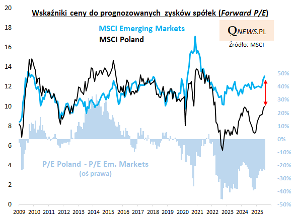 Przypomnijmy, że bezpośrednio po rozpoczęciu rosyjskiej inwazji w 2022 roku wyceny krajowych spółek zostały zepchnięte w dół nieproporcjonalnie mocno w porównaniu z rynkami wschodzącymi, jako głównym punktem odniesienia. Na jesieni 2022 wskaźnik ceny do prognozowanych zysków spółek z MSCI Poland znalazł się niemal 50 proc. (!) poniżej analogicznego wskaźnika liczonego dla MSCI Emerging Markets - na tle historii to był stan rzeczy dość bezprecedensowy. Wcześniej podobna sytuacja pojawiła się na jesieni 2020, w trakcie drugiej fali pandemii, ale to był chwilowy epizod.