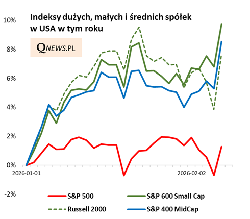 Czyżby te różnice w stopach zwrotu w pierwszych tygodniach roku były zwiastunem trwalszej zmiany "mody" rynkowej? Przypomnijmy, że w poprzednich latach zdecydowanie górą był indeks największych spółek, głównie za sprawą boomu AI, a benchmarki małych i średnich firm na Wall Street pozostawały w cieniu.