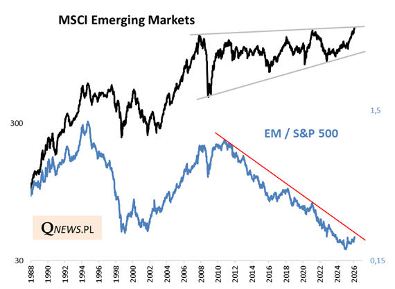 - Po opisywanym w ub.r. pokonaniu poprzedniego rekordu z 2021 roku indeks MSCI EM doszedł do linii łączącej ów szczyt z tym z 2007 roku - ta linia to techniczny opór, a zarazem górne ograniczenie ogromnej, wieloletniej formacji trójkąta;