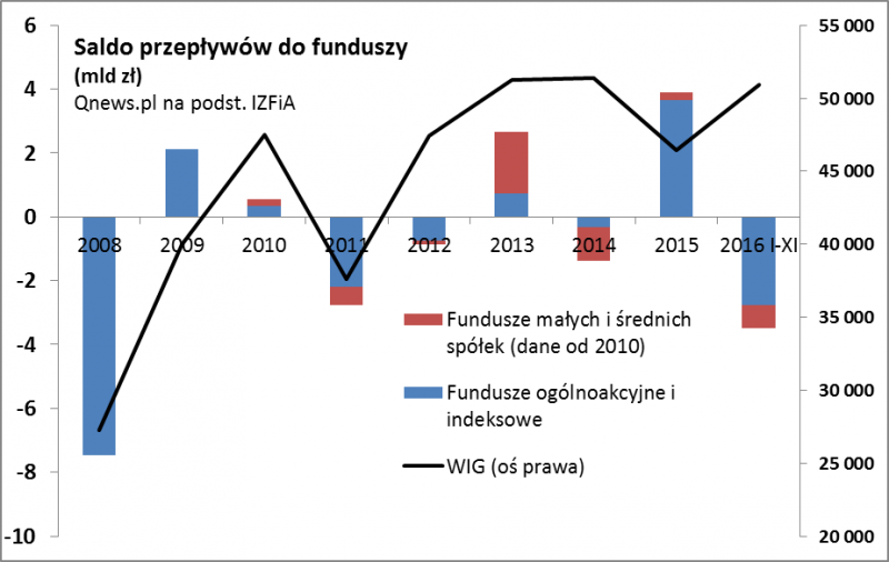 Znamy już dane Izby Zarządzającej Funduszami i Aktywami nt. napływów do funduszy w pierwszych jedenastu miesiącach roku. Uwagę skupimy na produktach typowo akcyjnych. Dane są dość zaskakujące, biorąc pod uwagę, że upływający rok zamyka się w miarę korzystnie dla akcji na GPW: WIG jest prawie 10% na plusie, a najlepszy tym razem mWIG40 jest prawie 20% "do przodu". A tymczasem - jak wynika z danych IZFiA - w okresie I-XI z funduszy ogólnoakcyjnych odpłynęło łącznie 2,8 mld zł. Kolejne 0,7 mld zł uciekło z funduszy małych i średnich spółek, czyli z tego segmentu GPW, który w tym roku radził sobie najlepiej. A to i tak nie wszystko, bo kapitały wycofywane były z rozmaitych funduszy typu zrównoważonego, które też mają w portfelach akcje.