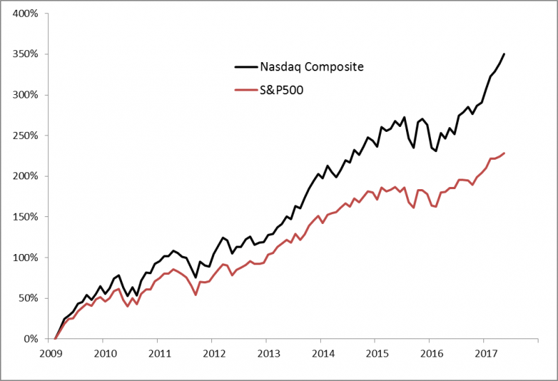 Wraz z szeroko komentowanym zaatakowaniem przez kurs Amazon.com - jednego z gigantów Wall Street - poziomu 1000 USD rozgorzała na nowo debata na temat tego czy spółki technologiczne nie są zbyt drogie. Niektórzy porównują nawet obecną sytuację do pamiętnej bańki internetowej, która pękła w 2000 roku. Wskazują, że od dołka z 2009 indeks Nasdaq Composite urósł o prawie ... 350% (!). Tylko w tym roku zdążył on podskoczyć o prawie 20%, bijąc na głowę nawet szerszy indeks S&P500.