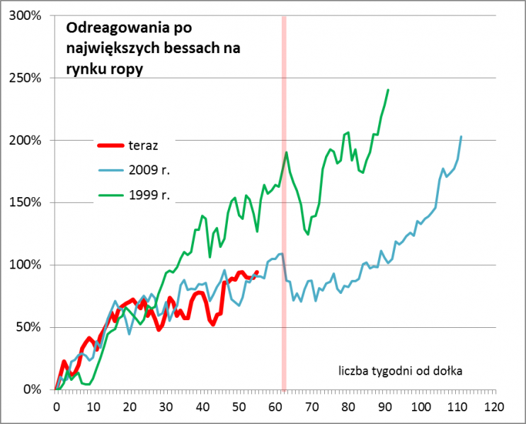 Okazuje się, że po 62-63. tygodniach od rozpoczęcia fali wzrostowej rozpoczynały się większe korekty (ale jeszcze nie koniec całego trendu). Gdyby trzymać się tego porównania (a widać przecież, że obecna ścieżka jest póki co bardzo zbliżona do tej z lat 2009-2010), to należałoby przyjąć, że do lokalnego szczytu na rynku surowca pozostało nam jeszcze jakieś 6 tygodni.