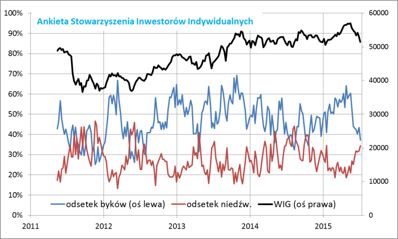 Według najnowszej, czwartkowej ankiety Stowarzyszenia Inwestorów Indywidualnych odsetek byków (optymistów) spadł do 37,2% (już tylko tyle ankietowanych wierzy w zwyżkę WIG w horyzoncie półrocznym) - to poziom najniższy od dziewięciu miesięcy!