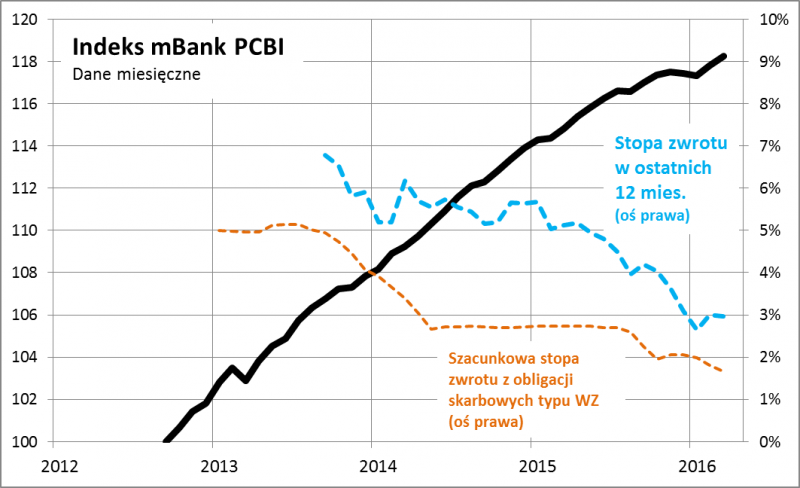 Dziś rzut oka na kolejną klasę aktywów, która znalazła się w badanych przez nas zdywersyfikowanych portfelach - obligacje korporacyjne emitowane przez polskie przedsiębiorstwa. Klasa ta od jesieni 2012 r. reprezentowana jest przez indeks mBank PCBI (Polish Corporate Bond Index). Warto podkreślić, że obejmuje on tylko najbardziej płynne obligacje. Jego skład zdominowany jest przez w miarę bezpieczne papiery emitowane przez duże spółki. Oczywiście jest to tylko część całego rynku "korporatów".