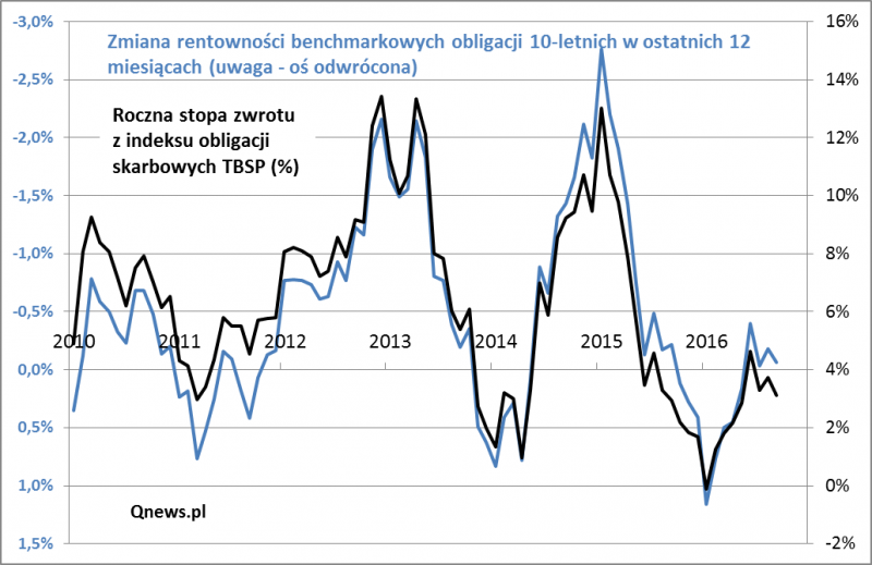 A od czego z kolei zależą stopy zwrotu z (funduszy) papierów skarbowych? Na krótką metę nie tyle od oprocentowania, lecz od wahań rentowności wymaganej przez inwestorów na rynku wtórnym (ta natomiast zależy od oczekiwań odnośnie przyszłej inflacji i stóp procentowych).