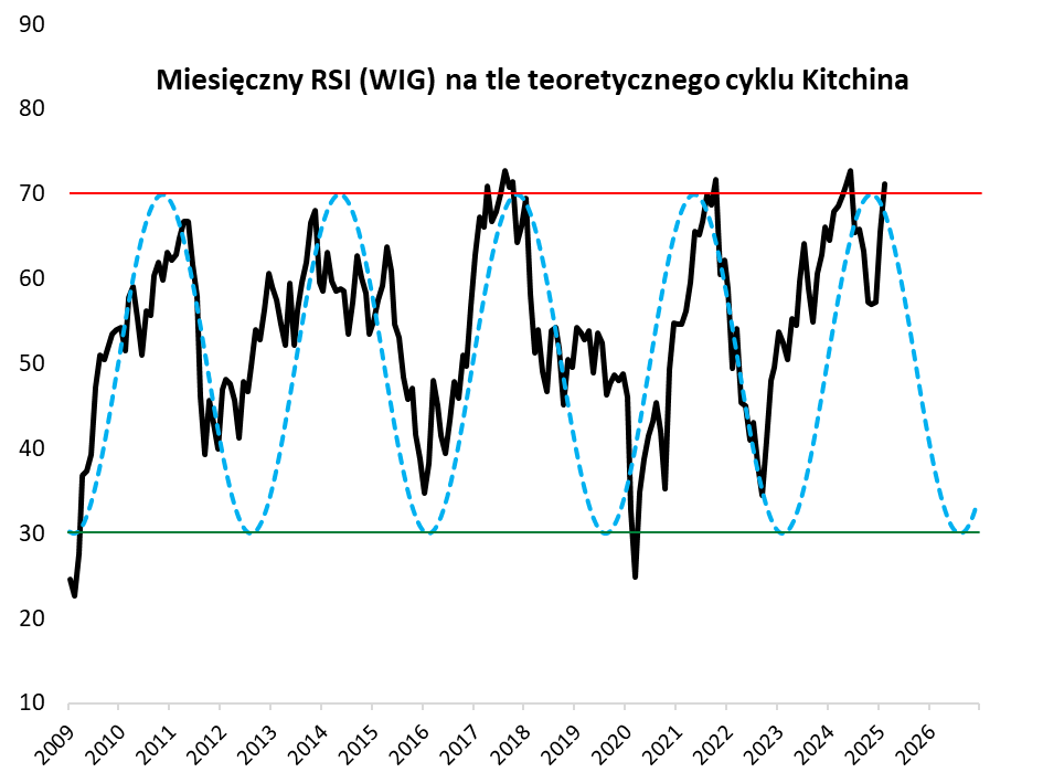 Porównanie z pierwszym rokiem „Trump 1.0” wygląda co prawda zachęcająco, ale nie wszystko pasuje do tej, ciągle relatywnie pozytywnej (choć już nie tak bardzo, jak wcześniej) analogii. Zupełnie nie pasuje tu opisywana przez nas typowa cykliczność na GPW. Po zdecydowanie przedwczesnym, jak się wydaje, spadku miesięcznego (tzn. opartego na danych miesięcznych) oscylatora RSI w drugiej połowie 2024, w wyniku styczniowo-lutowego rajdu ten stosowany przez nas do analizy dłuższego cyklu wskaźnik znów znalazł się w strefie wykupienia (a raczej znajdzie się tam, jeśli WIG zakończy luty na poziomie co najmniej takim, jak w momencie pisania tego artykułu). Powracając do modnych porównań z pierwszą kadencją Trumpa, odczyt RSI w okolicy historycznych szczytów, w połączeniu z perspektywą zakręcania tzw. cyklu Kitchina w dół na przestrzeni tego roku, przypominają z kolei nie tyle początek 2017, lecz raczej przełom 2017/18, kiedy impuls wzrostowy już ulegał wyczerpaniu.