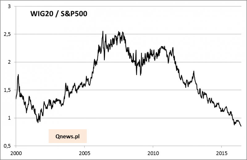 Czy uporczywa słabość WIG / WIG20 względem amerykańskiego odpowiednika oznacza, że polski rynek akcji należy definitywnie skreślić z listy kandydatów do portfela (takiego jak np. tutaj)? Byłoby tak, gdyby można było precyzyjnie stwierdzić, że "supercykl słabości" musi się jeszcze długo utrzymać. A co do tego nie ma żadnej pewności. "Supercykl" jest już bowiem tak zaawansowany (zarówno pod względem czasu trwania, jak i głębokości), że należałoby raczej rozważać prawdopodobieństwo jego odwrócenia w kolejnych latach.