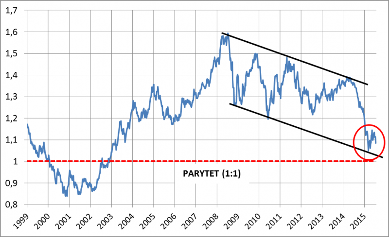 Po czterech miesiącach od ustanowienia wieloletniego minimum w okolicy 1,05 notowania euro względem dolara amerykańskiego wciąż nie mogą zdecydowanie odbić się od dna. W naszej analizie pokażemy, że taki stan rzeczy ma daleko idące konsekwencje dla wielu innych rynków oraz zastanowimy się czy jednak dojdzie do odwrócenia trendu.