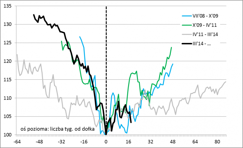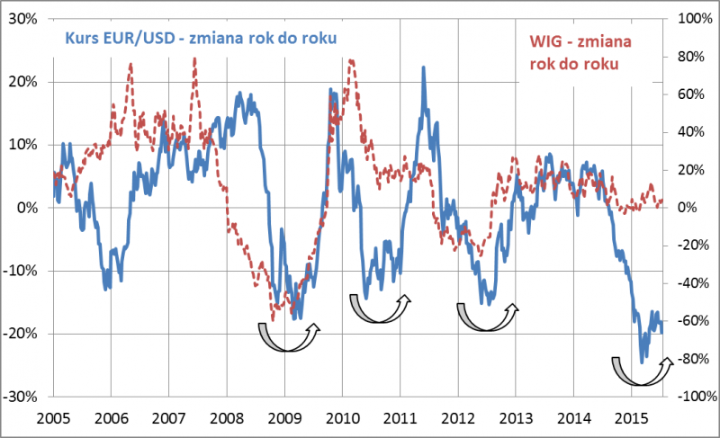 Z kolei słabe surowce to słabe rynki wschodzące (o których pisaliśmy dwa tygodnie temu), a stąd już prosta droga do rodzimej GPW. Zauważyliśmy, że od czasu globalnego kryzysu finansowego w 2008 r. bardzo wzmocniła się korelacja krajowych indeksów z notowaniami EUR/USD. Najlepiej widać to przez pryzmat rocznych (52-tygodniowych) zmian. Rekordowo niska dynamika EUR/USD zdaje się być kotwicą dla rocznej dynamiki WIG-u i innych indeksów GPW.