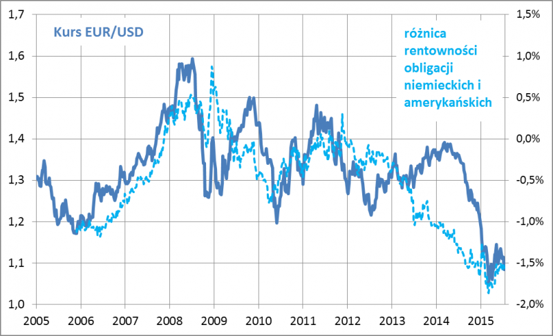 Warto jednak zwrócić uwagę, że ta zależność nie jest idealna. Zdarzały się już poważne odstępstwa od tej reguły. Dwie ze wspomnianych trzech fal wzrostowych w ostatnich latach miały miejsce mimo równoległego pogarszania się różnicy rentowności obligacji. Bazowały raczej na rosnących oczekiwaniach rynkowych na poprawę koniunktury gospodarczej w strefie euro. Może i tym razem taki scenariusz byłby możliwy?