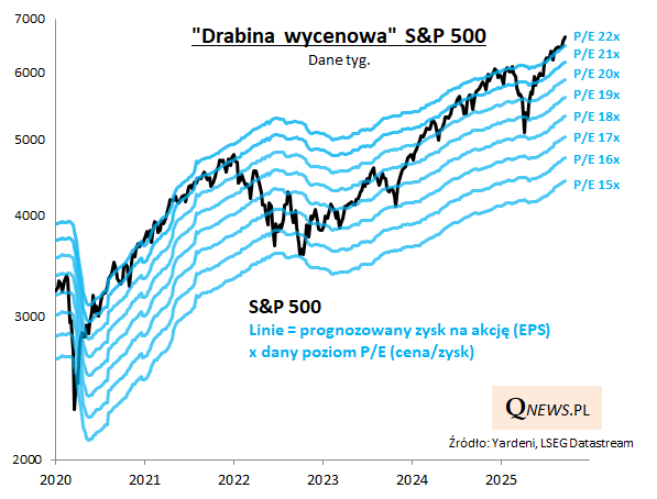 Połączenie tych dwóch elementów dobrze widać na naszej "drabinie wycenowej". S&P 500 wspina się coraz wyżej na jej "szczeblach", ale również one przesuwają się stopniowo na coraz wyższe pułapy. Teoretycznie przy sprzyjających warunkach ekonomicznych (w miarę stabilny wzrost gospodarczy, niższe stopy procentowe) i przy braku jakichś szoków (takich jak cła Trumpa) taki stan rzeczy może się utrzymać jeszcze przez dłuższy czas. Oczywiście jednocześnie trudno byłoby tu mówić o jakiejkolwiek okazji zakupowej - ta pojawiłaby się dopiero, gdyby S&P 500 mocniej potknął się w ramach swej wspinaczki i osunął o przynajmniej kilka szczebli na naszej drabinie (a jak pokazał kwiecień, to może się odbyć błyskawicznie).