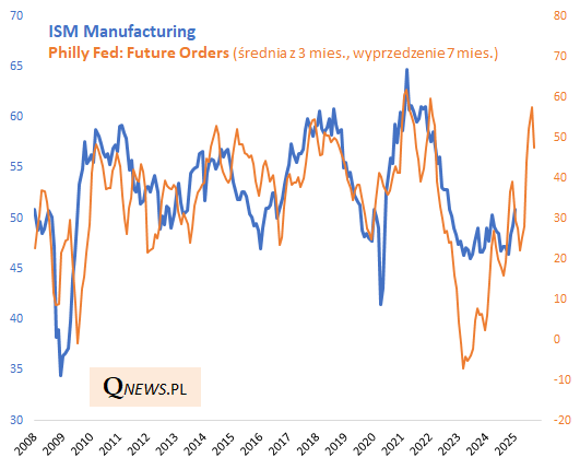 Jeśli założyć, że "Philly Fed" ma - jak sugerowałby poniższy wykres - właściwości wyprzedzające (wynoszące nawet 6-7 miesięcy!) względem flagowego ISM...