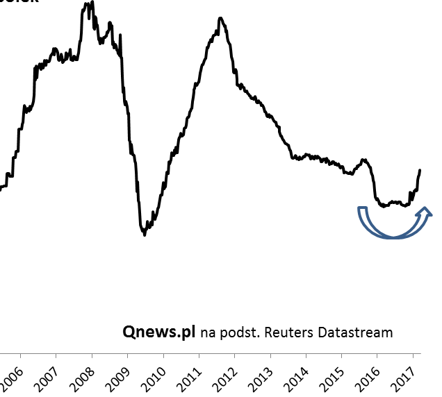 Wygląda więc na to, że trend spadkowy zysków trwający od 2011 roku dobiegł końca i mamy przełom. Przełom porównywalny z rokiem 2009 lub 2003. Ponieważ prognozowane zyski widoczne na wykresie poruszały się historycznie w dość stabilnych trendach, więc można mieć uzasadnioną nadzieję na kontynuację poprawy w perspektywie co najmniej kilkunastu miesięcy. Tym bardziej, że poprawa startuje z niskiego pułapu.