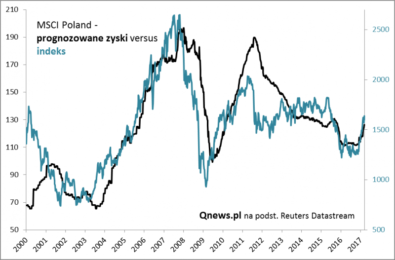 Zyski spółek - nawet te prognozowane przez analityków, jak w przypadku MSCI Poland - same w sobie nie wyprzedzają kursów akcji. Widać, że ostatni wystrzał prognoz zysków odbył się równolegle do wystrzału notowań akcji na GPW. Ponadto indeksy (czy to MSCI Poland czy też WIG20) na krótką metę potrafią być o wiele bardziej podatne na wahania, niż zyski. Czyli krótko mówiąc, przełom w wynikach przed ewentualną głębszą korektą na giełdzie niekoniecznie uchroni, choć w perspektywie wielomiesięcznej jest to argument za kontynuacją hossy.