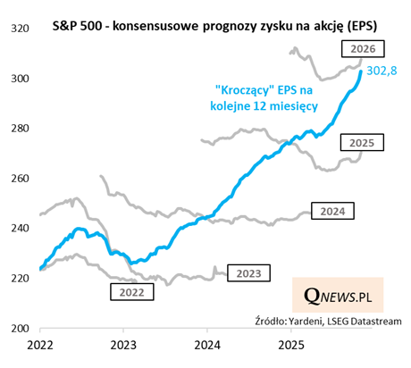 Rewizje sprawiły, wraz z efektem upływającego czasu i przesuwaniem się uwagi coraz bardziej na rok 2026, że po raz pierwszy w historii zysk na akcję prognozowany na kolejne 12 miesięcy (będący średnią ważoną prognoz na kolejne 2 lata) przekroczył "okrągły" poziom 300 $.