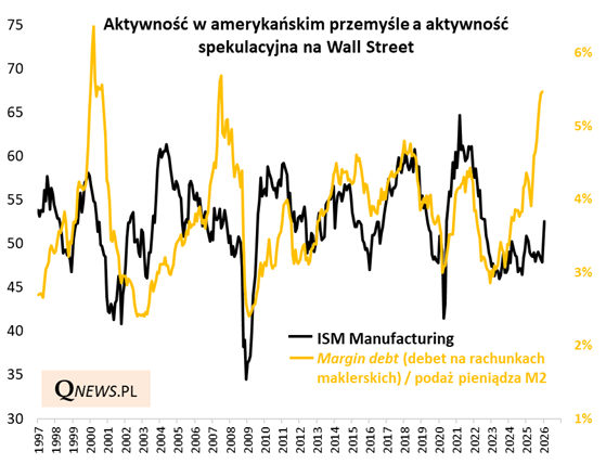 O tym, że nie zawsze giełda = gospodarka, przekonuje poniższy wykres. Podczas gdy aktywność w przemyśle mierzona ISM wreszcie śmielej wkracza w fazę ożywienia, to wydaje się mocno spóźniona względem Wall Street, gdzie opisywany przez nas już wcześniej barometr aktywności spekulacyjnej (poziom debetu na rachunkach maklerskich odniesiony do podaży pieniądza w gospodarce) jest na poziomie najwyższym od 2007 roku.