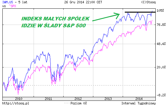 Jeśli ktoś doświadczył w tym roku przysłowiowego rajdu św. Mikołaja, to przede wszystkim Wall Street. Indeks S&P 500 wspiął się na nowe szczyty hossy. Co bardzo ważne, to samo udało się wreszcie indeksowi małych spółek (Russell 2000). Oznacza to, że anulowana została negatywna dywergencja (szczyty dużych spółek i zadyszka małych) zagrażająca trendowi wzrostowemu.