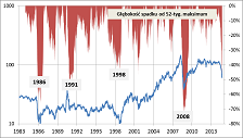 Gwałtowna przecena ropy wyhamowała, ale nie widać jeszcze poważniejszej próby podniesienia notowań. Już teraz fala spadkowa należy do sześciu najsilniejszych w historii, choć w porównaniu np. z tą z 2008 r. nie jest jeszcze skrajnie głęboka (gdyby czysto hipotetycznie założyć, że cena miałaby spaść o tyle co w 2008 r., to spadek zatrzymałby się dopiero gdzieś w okolicach 35 USD za baryłkę w przypadku ropy Brent). Historia pokazuje jednocześnie, że notowania ropy potrafiły się często odbijać równie szybko i gwałtownie jak wcześniej spadały.