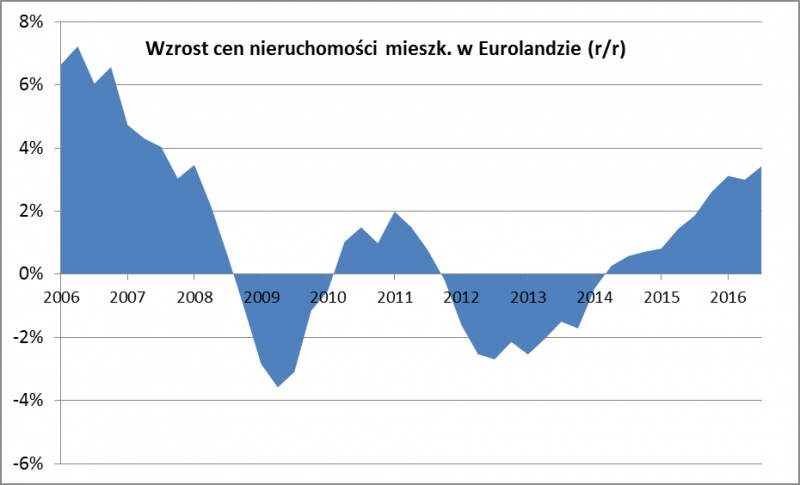 Wychodzenie cen mieszkań w Europie z pokryzysowego marazmu postrzegamy pozytywnie, jako oznakę "normalizacji" gospodarczej. Ponieważ jest to najważniejszy element majątków większości gospodarstw domowych, to wzrost wartości tych majątków powinien mieć korzystny wpływ na nastroje konsumentów. Inna sprawa, że prawdopodobnie w jakimś stopniu hossa na tych rynkach to efekt uboczny skrajnie niskich stóp procentowych, wymuszonych przez Europejski Bank Centralny. Jest też druga strona medalu - wzrost cen nieruchomości jest zupełnie pomijany przez EBC przy planowaniu polityki pieniężnej, gdyż bank dogmatycznie skupia uwagę wyłącznie na wskaźniku cen towarów i usług konsumpcyjnych, chcąc popchnąć go w kierunku celu na poziomie 2%. Tymczasem indeks cen mieszkań w III kwartale był 3,4% wyżej niż rok wcześniej.