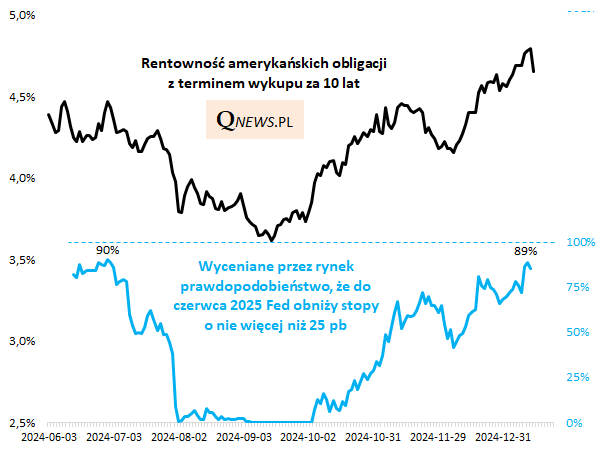 Bez wątpienia rynek ma tendencję do "przestrzeliwania" oczekiwań odnośnie stóp procentowych w jedną lub w drugą stronę. Można się zastanawiać, czy ostatnio nie mieliśmy do czynienia z nadmiernym "przekręceniem" się rynku w stronę jastrzębią. Ważne będą kolejne dane inflacyjne (te najnowsze są delikatnie lepsze) oraz rzeczywiste posunięcia administracji Trumpa w sprawie np. ceł (rynek ostatnio mocno obstawiał odbicie inflacji na skutek ceł - zobaczymy na ile to ryzyko będzie się materializować).