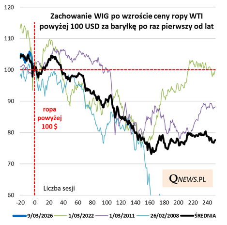 O tym, że jest poważny czynnik ryzyka dla rynków w średnim terminie, świadczyć może prosta analiza historyczna. Zebrałem wszystkie przypadki, w których ropa WTI również przekroczyła próg 100 USD po wcześniejszym pobycie na dużo niższych poziomach, i również w efekcie dynamicznej zwyżki. Ku mojemu zaskoczeniu okazało się, że wszystkie te epizody miały miejsce na początku marca lub w końcówce lutego (czyżby istniał tu jakiś efekt sezonowy wzmacniający siłę innych czynników?):