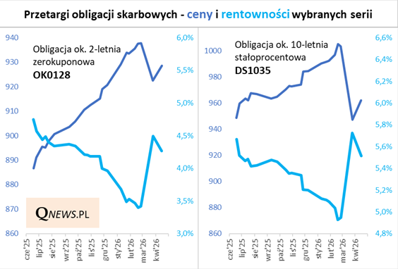 Ostatnie dni to nie tylko najnowsze dane o finansach budżetu, ale też pierwszy w kwietniu przetarg hurtowych obligacji skarbowych. Przy okazji jedynego marcowego przetargu pisałem o silnym spadku cen, a jednocześnie o wzroście rentowności oferowanych papierów. Kwietniowy przetarg jest pod tym względem o tyle ważny, że przyniósł pierwsze oznaki stabilizacji. Ceny sprzedaży były nieco wyższe, a rentowności nieco niższe niż w marcu. A to wszystko przy większym niż na jedynej marcowej aukcji popycie inwestorów.