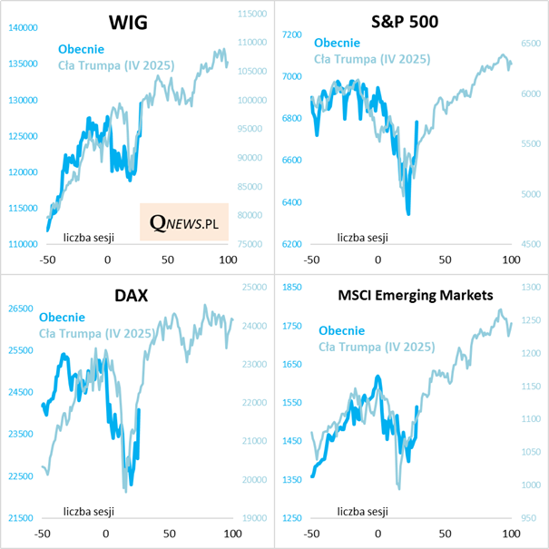 To podążanie za wypracowanymi scenariuszami pokazuje, że ciągle skomplikowane otoczenie geopolityczno-gospodarcze nie musi być decydującą przeszkodą we wspinaczce indeksów (przed niespełna rokiem wyższe cła też nie przeszkodziły w odreagowaniu - wystarczyło to, że okazały się niższe w porównaniu z początkowymi groźbami).