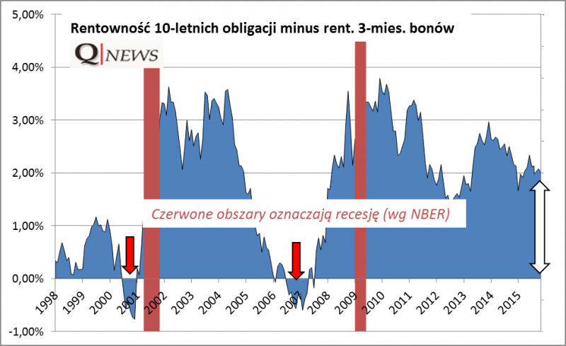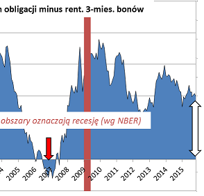 Wzrost krótkoterminowych stóp procentowych w USA uruchamia pewien ważny na dłuższą metę proces. Historycznie wszystkie recesje za oceanem w okresie powojennym były poprzedzone przez specyficzną sytuację: rentowności krótkoterminowych papierów były powyżej rentowności obligacji 10-letnich (ten nietypowy stan rzeczy nazywany jest "odwróconą krzywą dochodowości"). Kiedy zatem i tym razem kilkumiesięczne papiery staną się bardziej atrakcyjne niż te długoterminowe, będzie to poważny sygnał ostrzegawczy. Mimo że proces dochodzenia do takiego stanu rzeczy został już uruchomiony, to na szczęście jeszcze daleka droga do tego "celu". 10-letnie skarbówki dają ciągle rentowność o niemal 2 pkt proc. wyższą niż 3-miesięczne bony.