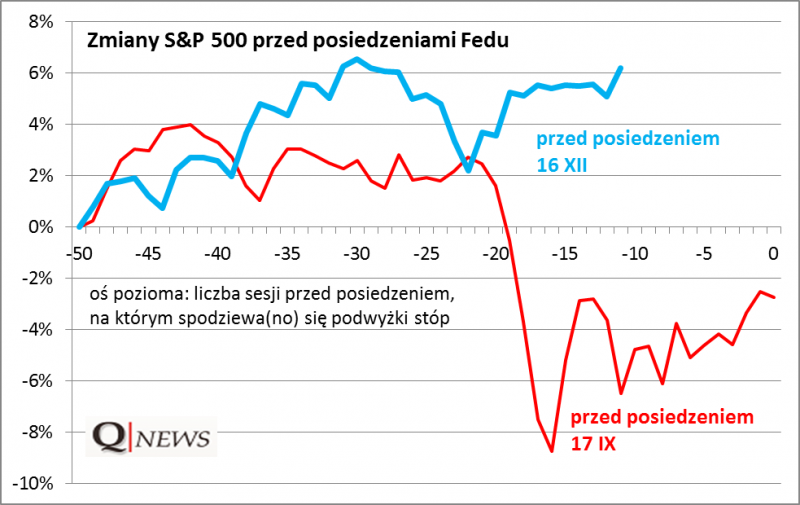 Takiego zjawiska nie było widać przed podwyżką planowaną na wrzesień - najwyraźniej rynek wtedy jeszcze nie był na nią gotowy, a teraz już chyba tak. Wrześniowy "falstart" poprzedzony został zresztą bardzo gwałtowną reakcją rynku akcji, który pogrążył się w największej od czterech lat korekcie spadkowej. Teraz dla odmiany S&P 500 znów wspiął się powyżej pułapu 2100 pkt.