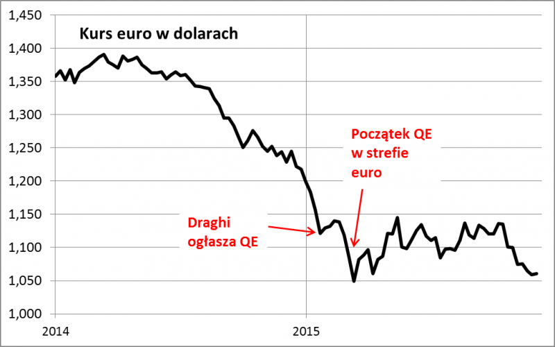 Warto tu zwrócić uwagę na ważną kwestię - samo QE nie doprowadziło do dalszego osłabienia euro względem dolara (a jedynie utrzymywało kurs na niskim poziomie). Fala osłabienia miała miejsce wcześniej, gdy rynek dyskontował europejskie QE.